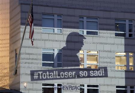 2日、ベルリンの米大使館の建物に映し出された「敗者」などの文字(AP)【拡大】
