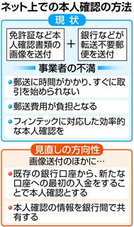 金融庁が、インターネット上での口座開設といった取引の手続き効率化に乗り出すことが20日、分かった。現状は郵便送付による本人確認が必要で、手間がかかると不満が高まっている。このため金融庁は関係団体と21日に研究会を立ち上げ、オンラインで本人確認を終えられる方策の検討を開始。金融とITを融合したフィンテックの普及に弾みをつけたい考えだ。