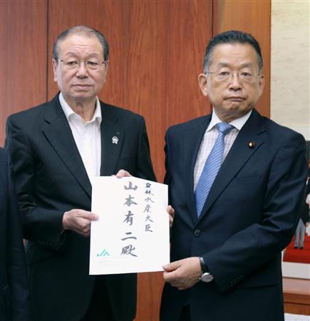 日本と欧州連合(EU)との経済連携協定(EPA)交渉で、全国農業協同組合中央会(JA全中)の奥野長衛会長は22日、山本有二農林水産相と会談し、豚肉や乳製品など重要な農産品を保護するよう求める要望書を提出した。山本氏は「国内の農業の永続性、再生産を考えながら交渉に臨む」と述べた。