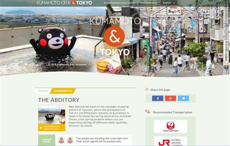東京都がインターネット上で紹介している、熊本の観光スポットや交通手段などを紹介するページ【拡大】