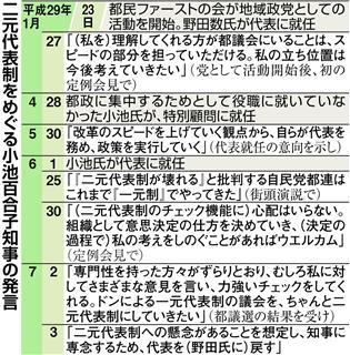 一方の小池氏は選挙戦を通じ「一部の有力都議の意向が反映されてきた自民中心の都政こそ、チェック機能が働いてこなかった」と反論を続けた。開票作業が進んだ2日夜、都民が第1党となることが確実になった際も「(都民都議は)力強いチェックをしてくれる」と強調していた。しかし、一夜明けた3日午前には「二元代表制への懸念があることを想定し、知事に専念する」と突如、代表を退くことを表明した。