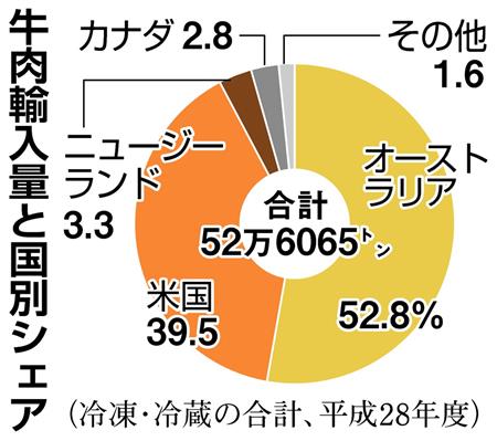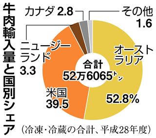 日本の冷凍牛肉の主要輸入国は米国とオーストラリアだが、日本と経済連携協定(EPA)を締結しているオーストラリアは今回のセーフガードの対象外となる。米国などの関税は来年3月31日まで、現行の38.5%の関税率は50%に引き上げられる。