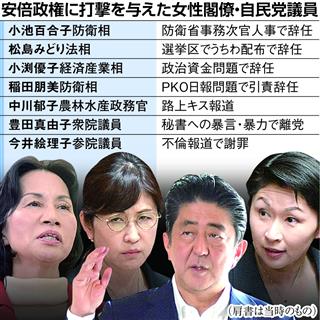 安倍晋三首相に「女難の相」がささやかれている。「女性が輝く社会」を掲げ、女性の積極登用を実践してきたが、女性閣僚や自民党女性議員は輝くどころか、政権の足を引っ張ってばかりだからだ。内閣改造・自民党役員人事を3日に控え、女性閣僚を起用するか否かは首相にとって頭痛の種となっている。(田北真樹子)