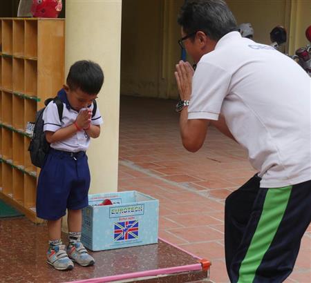「先生さようなら」。カンボジア式で土居清美校長(右)にあいさつをするシーセフリーダーズアカデミーの園児。日本式の「しつけ」をカンボジア社会に定着させることもアカデミーの重要な教育方針だ=プノンペン市内(木村文撮影)【拡大】