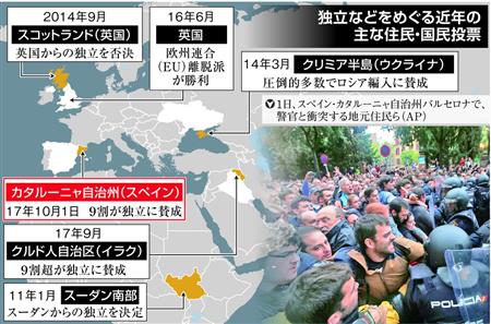 カタルーニャ自治州の住民投票は投票率が4割にとどまり、ラホイ首相は結果を全面的に否定する構えだ。警察と有権者の衝突による負傷者は800人を超えるなど混乱は拡大しており、スペインは大きな政治危機を迎えた。