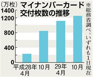 マイナンバーカードの交付枚数は、昨年10月3日時点で約850万件だったが1年ほどで約1250万枚に増えた。しかし、野田総務相も「なかなか(普及が)進まない中で考えないといけない」と認めるほど普及は伸び悩む。