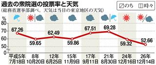 一般的に、外出を避けがちな雨や、行楽に出かけやすい晴れは投票率は下がり、曇りは上がるとされる。東京が雨だった5年は67・26%、曇りの17年は67・51%だった。晴れの24年は59・32%で、過去最低の52・66%となった前回は「晴れのち曇り」だった。