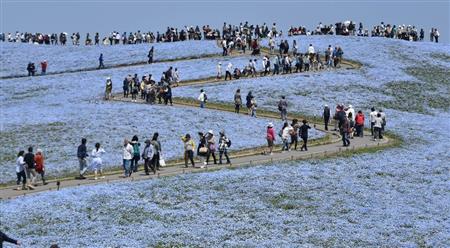 平成29年度県政世論調査で「知人に自慢したいもの」の設問で1位となった国営ひたち海浜公園。春にはネモフィラが色鮮やかに咲き誇り、観光客を楽しませる=平成29年4月、ひたちなか市馬渡(丸山将撮影)【拡大】
