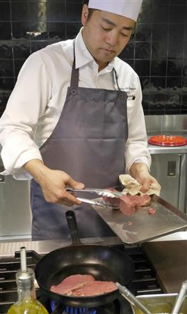 大和牛の試食会でフィレ肉のステーキを調理するシェフ=奈良県桜井市の「オーベルジュ・ド・ぷれざんす桜井」【拡大】