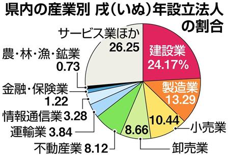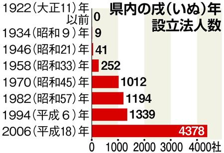 平成30年の十二支は戌(いぬ)。全国の法人270万社(個人企業、倒産、休廃業・解散企業など除く)のうち、戌年に設立された法人は17万155社。都道府県別では最多が東京都の3万6341社。埼玉県では8225社で、全国第5位となった(東京商工リサーチ調べ)。