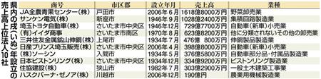 埼玉の県内戌年設立の法人で、最も設立が古いのは9年1月設立のイナガキ商事(川口市)、次いで同年2月のハス金物店(深谷市)、同年3月の吉田商会(川越市)と続く。業歴の古い順では上位9社までが9年に設立された法人だったが、同年は県庁所在地の旧浦和市(現さいたま市)が市制施行された年でもある。