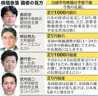 また、みずほ総合研究所の武内浩二主席エコノミストは「日本株は米国ほどの割高感はなかったが、海外投資家が世界的に株を売る動きに影響を受け、日本株の売りにつながった」と説明する。「米国景気は悪くなく、米国株の調整の動きが落ち着けば、日本株も徐々に値を戻す」と見通す。
