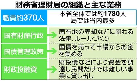 A 「理財」とは「財産の運用」を意味する言葉で、国債や国有地といった国の資産を管理している。主な業務は3つある。(1)国有地の売却などに関わる国有財産管理(2)国債を売って市場からお金を集める国債管理(3)国債の一種である財投債の発行などで調達した資金を貸し出す財政投融資-だ。局には9つの課があり、職員は約370人で、本省では最多だ。