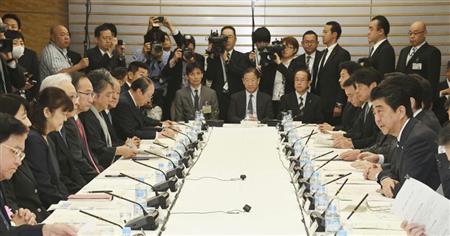 首相官邸で開かれた知的財産戦略本部・犯罪対策閣僚会議。手前右端はあいさつする安倍晋三首相=13日午前【拡大】
