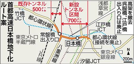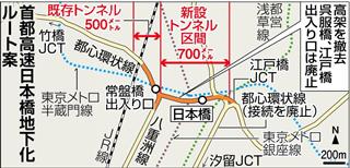 東京・日本橋の真上を高架で通る首都高速道路の地下化計画で、国土交通省と東京都、首都高速道路などでつくる検討会は22日、都心環状線を江戸橋ジャンクション(JCT)付近から地下化し、日本橋の直下を通過して既存の八重洲線トンネルに接続する案を決定した。江戸橋JCTからJR東京駅北側までの約1.2キロの区間が地下を通ることになる。
