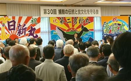 6月7日夕、東京・永田町の憲政記念館にちょっと変わった乾杯の発声が響き渡った。「ホエール(クジラ)」と「ほえる」を合わせた掛け声を挙げたのは、「捕鯨の伝統と食文化を守る会」の参加者たちだ。第30回の節目の会合ということもあり、捕鯨関係者や国会議員など約500人が参加した。