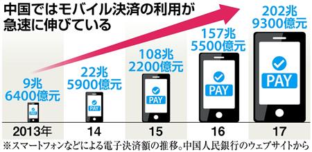 中国の電子商取引(EC)大手アリババグループが運営する電子決済サービス「支付宝(アリペイ)」などの利用者は延べ約12億人。中国人民銀行(中央銀行)の調べで、2017年のモバイル決済(スマートフォンなどによる電子決済)額は前年比28.8%増の202兆9300億元(約3300兆円)に達した。人民銀の20日の発表によると、今年4~6月期も前年同期比60.2%増のペースで伸びている。都市部を中心に中間所得層の消費拡大の大きな波にも乗っかった。