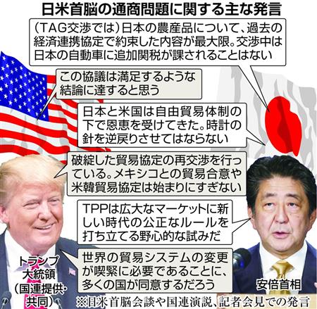 安倍晋三首相は26日、米国が検討していた自動車輸入制限の回避に向け“次善の策”として、トランプ大統領と農産物などの関税引き下げに向けた「日米物品貿易協定(TAG)」の交渉開始で合意した。環太平洋戦略的経済連携協定(TPP)以上の譲歩をしないとしたことで、日本側の主張も通せた。しかし、2国間交渉に持ち込まれたことで、保護主義に対抗するための多国間の自由貿易体制には逆風となりかねない。