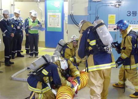 大飯原発では1日、現在運転中の大飯3号機でポンプ室から出火したと想定して関電が消火訓練を行い、規制委が視察した。山中伸介委員は検査官とともに、ボンベを背負った関電の消防隊員らが、出火元の部屋の外から扉に排煙用ホースを取り付ける様子などを確認した。