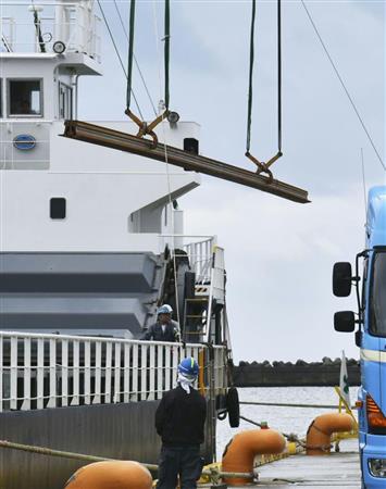金沢港で陸揚げされる、石川県内の北陸新幹線に敷設されるレール=9月27日、金沢市【拡大】