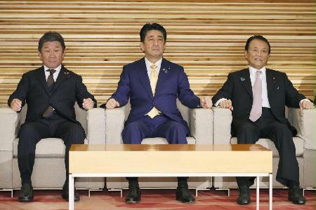 閣議に臨む(左から)茂木敏充経済再生相、安倍晋三首相、麻生太郎財務相=6日午前、首相官邸【拡大】