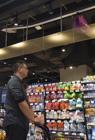 中国電子商取引(EC)最大手アリババグループの広報マネジャーの趙亜楠氏が、杭州市の本社近くのビル内にあるスーパー「盒馬鮮生(フーマー・フレッシュ)」で笑顔を見せた。