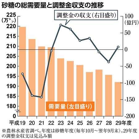 「近年は猛暑でジュースやアイスなどが売れたはずだが、砂糖消費の拡大にはつながっていない」。ある製糖業関係者は肩を落とす。農林水産省の調べによると、平成19年度(砂糖年度19年10月~20年9月末)に219万トンだった砂糖の総需要量は、29年度に192万トンまで減少。この10年間で1割以上減った。