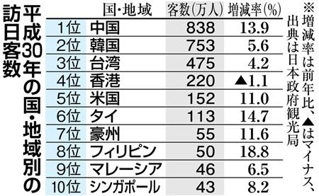 また、日本政府観光局(JNTO)は同日、18年の訪日客数(推計値)を3119万1900人、出国日本人数は6%増の1895万4000人で14年以来となる過去最高を記録したと発表。訪日客の主要20カ国・地域別では、自然災害影響を受けた香港が1.1%減となったが、残る19カ国・地域が過去最高で、トップ3は中国が13.9%増の838万100人、韓国が5.6%増の753万9000人、台湾は4.2%増の475万7300人だった。