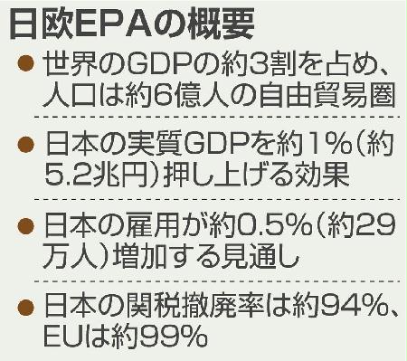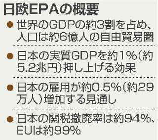 日本と欧州連合(EU)の経済連携協定(EPA)が2月1日の午前0時に発効する。昨年12月30日に発効した環太平洋戦略的経済連携協定(TPP)と合わせ、日本は世界のGDPの4割弱を占める自由貿易圏に加わることになる。両協定により単純合算で、国内総生産(GDP)が約13兆円押し上げられると試算されるなど、日本の成長戦略にとって意義は大きい。