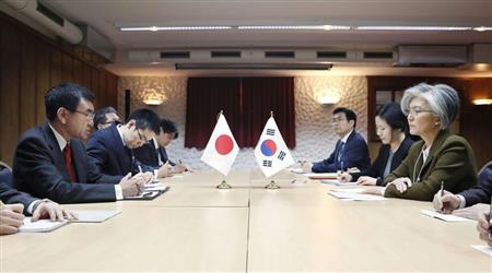 韓国の康京和外相(右端)と会談する河野太郎外相(左端)。いわゆる徴用工訴訟の問題では双方の主張は対立したままだ=1月23日、スイス・ダボス(共同)【拡大】