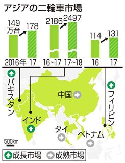 かつて最大市場だった中国は四輪車への移行もあり伸び悩んでいる。これまで成長の主役だったベトナムやタイの販売台数も鈍化傾向にある。二輪車世界首位であるホンダの五十嵐雅行執行役員は「成熟市場なので、これ以上は伸びにくい」と話す。愛車に個性を求める客層が増え、細身のボディーや剛性のあるボディーなど地元の人気に合わせたモデルを発売しているという。