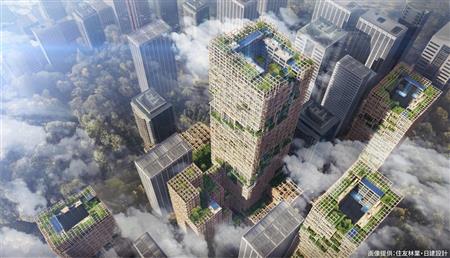 住友林業が計画する高さ350メートルの超高層木造建築の完成イメージ(同社提供)【拡大】