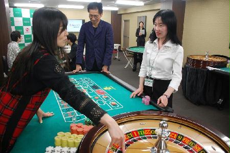 大阪府大東市から教室見学に訪れたという会社員の女性は、設置されたルーレットなどのテーブルを興味深げに眺めながら語った。