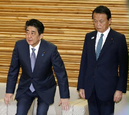 閣議に臨む安倍首相(左)と麻生財務相=5日午前、首相官邸【拡大】