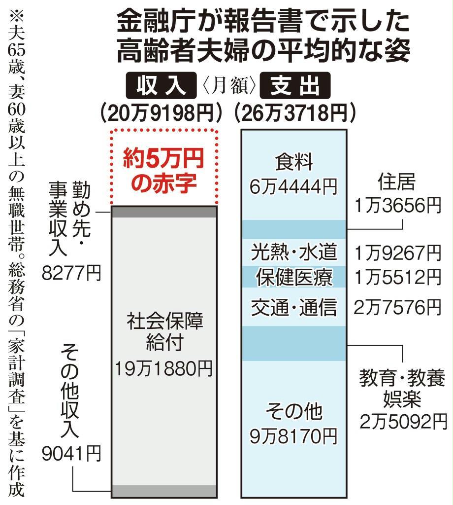 しかし、この前提となる現状説明の部分で、高齢夫婦世帯の平均的な姿に関連し、「(老後の)不足額の総額は1300万~2千万円」などと記したことは失点だった。実際は退職金や預貯金もあるため「不足額」との表現は言い過ぎであるうえ、支出水準は世帯によって大きく異なるため平均値では誤解を招きかねない。金融庁の別の幹部も「単純化しすぎて、かえって混乱を招いた」と話す。