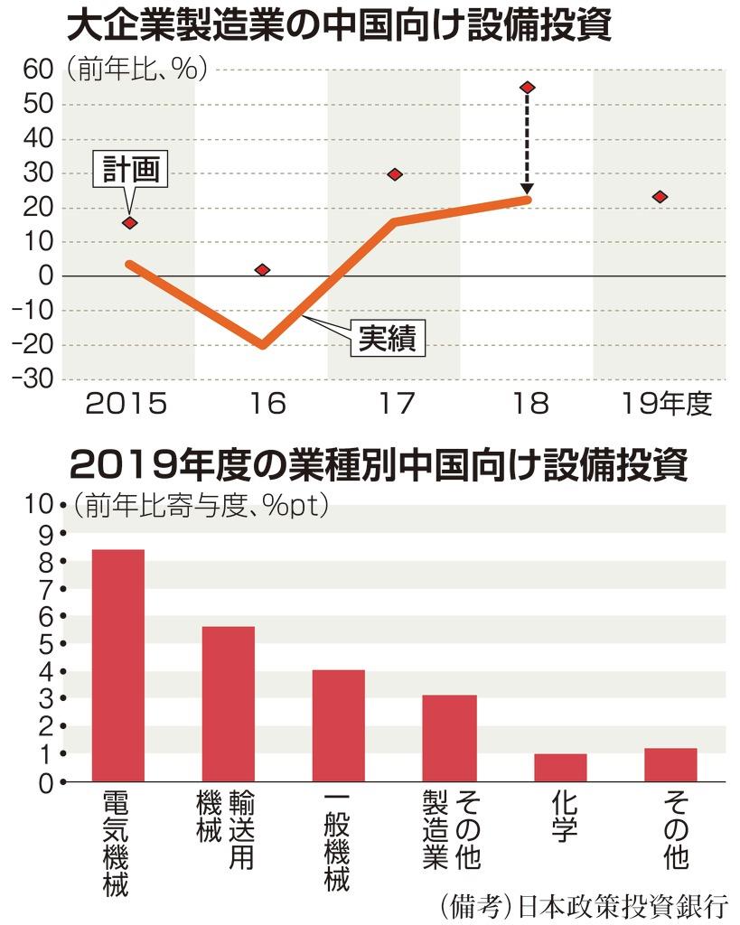 日本政策投資銀行(DBJ)が8月に公表した設備投資計画調査では、日本の大企業製造業の中国向け設備投資は、2018年度に前年比22.5%増と、2年連続で大きく増加した。自動車部品メーカーが、ハイブリッド車(HV)も含めた電動化を見据えた投資を実施したほか、化学では半導体向けの能力増強がみられた。ただし、昨年同時期の調査における計画は同55.2%増であり、実績にかけての下方修正は例年より大きめとなった。米中貿易摩擦の影響により、計画の延期や見直しを実施した企業があったとみられる。