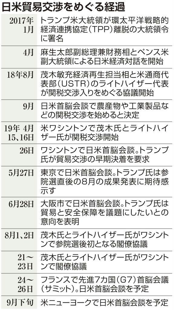 日程を1日延長するなど3日間にわたった今回の日米貿易交渉の閣僚級協議では、一気に大枠合意にこぎつけた。来年に大統領選を控えるトランプ米大統領が早期合意を強く求めていたことを背景に、双方が一定の譲歩を見せたからだ。今後、正式合意や署名を経て、日本が秋の臨時国会で協定案を提出して承認されれば、年内にも協定が発効する可能性がある。
