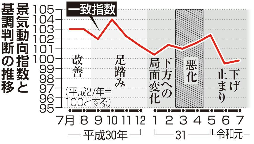 内閣府が6日発表した7月分の景気動向指数(速報値、平成27年=100)によると、景気の現状を示す一致指数は前月比0・3ポイント上昇の99・8で、2カ月ぶりに上昇した。事前に定められた基準に機械的に当てはめて決める基調判断は、景気後退の動きが下げ止まっている可能性が高いことを示す「下げ止まり」に据え置かれたが、消費税増税直後の来月7日に発表される8月分では景気後退の可能性が高いことを示す「悪化」に再び引き下げられる可能性も指摘されている。