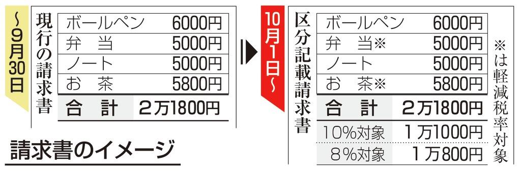 企業が10月以降に消費税の納税額を正確に計算するためには、8%の品目に印などが付いた「区分記載請求書」が必要だ。さらに2023年10月からは、記載する税額を一段と詳しくした「インボイス」(適格請求書)が求められる。請求書を発行する側の飲食料品の販売業者なども事務負担が重くなる。