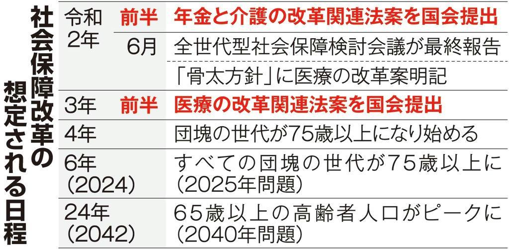政府が「全世代」と強調するのは、「子ども・子育て支援」を社会保障の一つに位置づけているためで、世論に受け入れられやすい幼保無償化などを先行させた。一方、国民の負担増が予想される医療、介護の制度改革には、高齢者を中心に反発が起きるのは確実で、改革実現のハードルは高い。