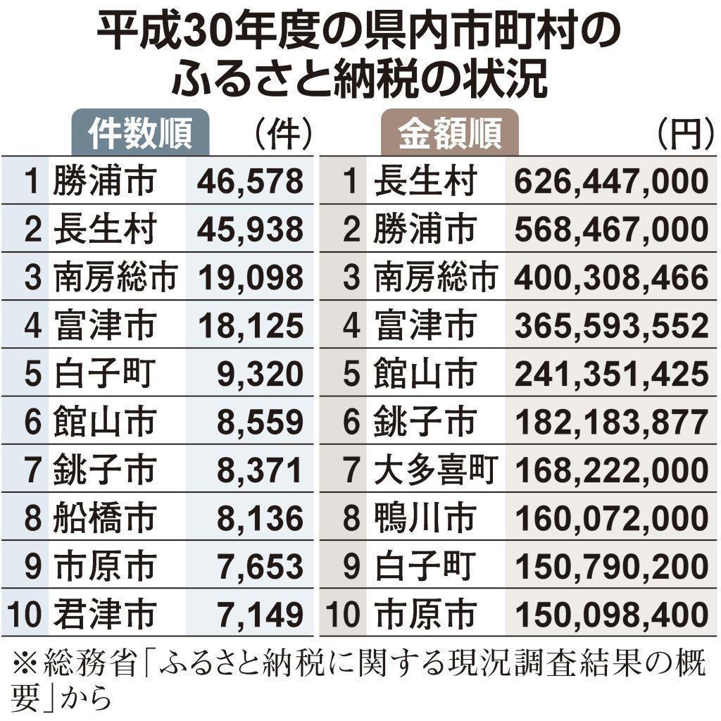 30年度の千葉県内市町村に対するふるさと納税の状況をみると、寄付件数では勝浦市(4万6578件)、長生村(4万5938件)、南房総市(1万9098件)がトップ3となっている。金額でも、長生村(6億2645万円)、勝浦市(5億6847万円)、南房総市(4億31万円)と同じ顔ぶれが並んでいる。