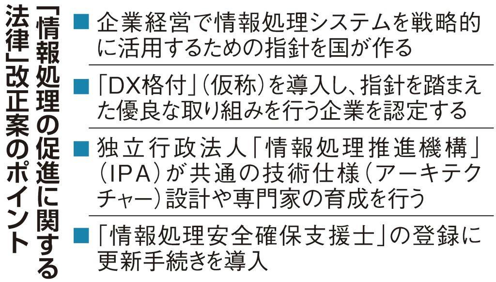 改正案は4日召集の臨時国会に提出する。情報処理システムを「企業経営において戦略的に利用する」ための運用・管理のあり方について、指針(「デジタルガバナンス・コード」)を設けることが柱となる。