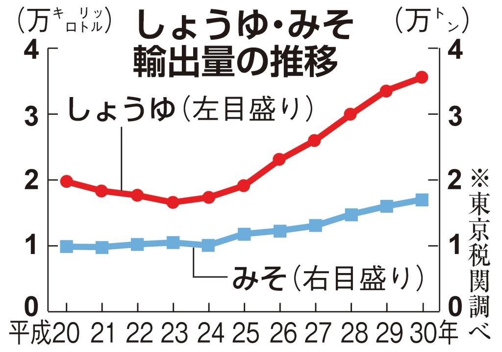 しょうゆとみその輸出が昨年、数量・金額ともに過去最高を更新したことが、東京税関の調べで分かった。今年に入ってからも8月までの数量でしょうゆは前年比2%、みそは10%も上昇。世界的な和食の人気や、健康志向の高まりが要因とみられる。いずれも東京港の輸出実績が全国で1位という。