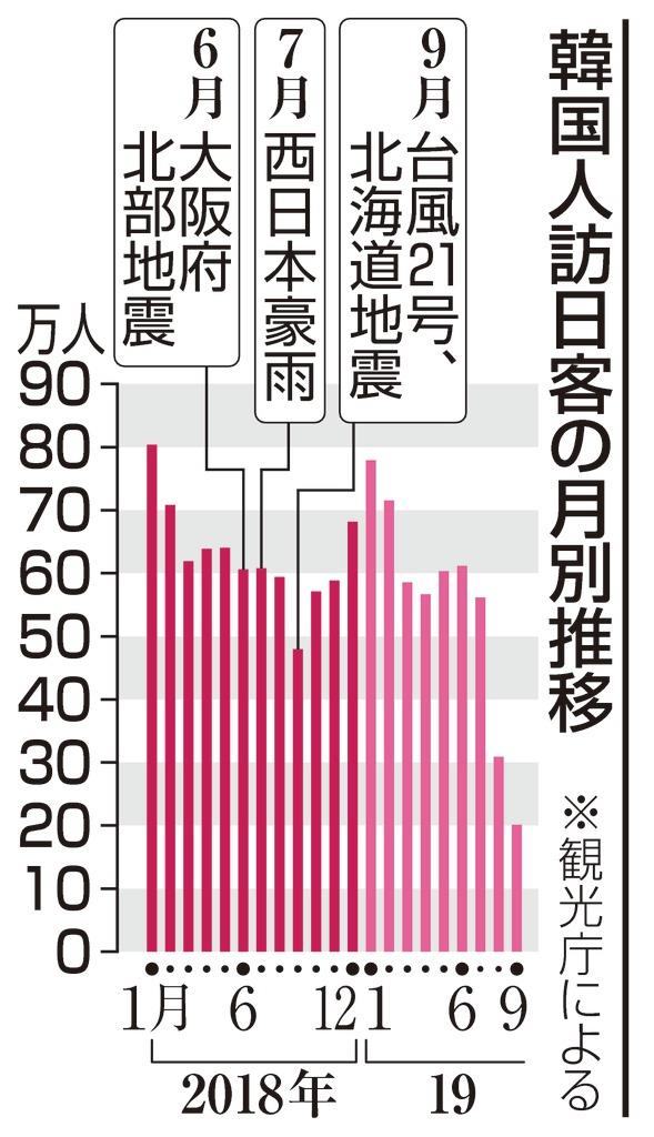 韓国人訪日客が一段と減ってきた。観光庁が発表した9月の訪日韓国人旅行者数は前年同月比58.1%減の20万1200人だった。減少は3カ月連続。8月の48.0%を上回り、日韓対立の影響が深刻化。この秋は韓国のプロ野球チームが日本でのキャンプを取りやめる余波もあり、ホテルに追い打ちをかける。例年、韓国の旧正月と重なる1~2月は訪日客が増える傾向にあり、事態の長期化を心配する声がある一方、日本人や中国人客に照準を合わせる動きも出てきた。