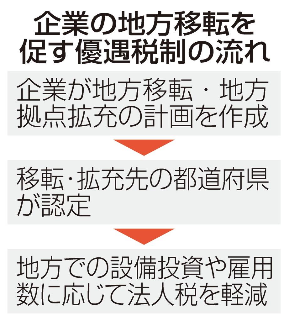 優遇税制は、事務所などを東京23区から地方に移すか、地方に元々ある拠点を拡充した企業が対象。企業側が具体的な移転・拡充の内容を示した計画を作成し、移転先の都道府県が認定すれば、地方で増やした設備投資額や雇用数に応じて法人税が軽くなる。