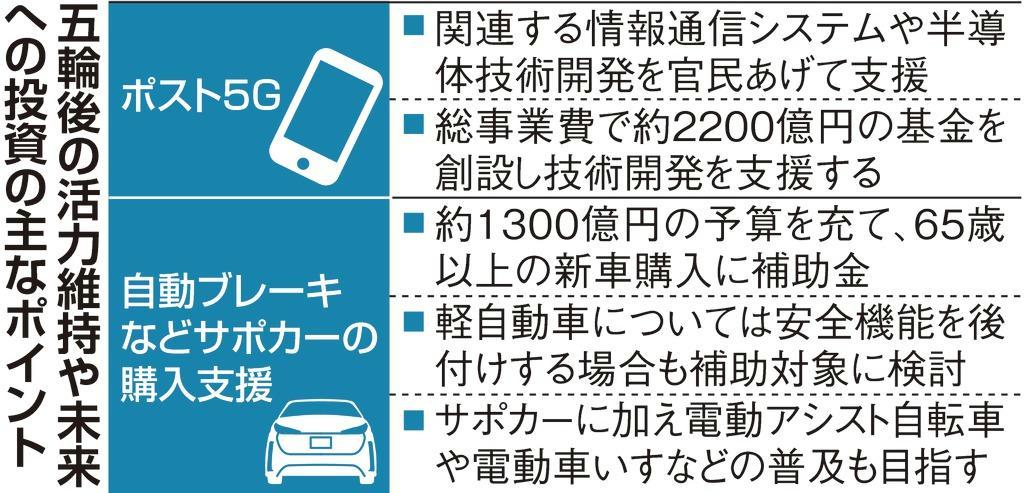 一方、高齢運転者による事故多発を踏まえ、自動ブレーキなど安全機能を備えた「安全運転サポート車(サポカー)」の購入資金を支援する。自動車メーカーの技術開発やサポカーの普及を促す狙いだ。サポカー普及には約1300億円を充て、65歳以上の新車購入などを補助する。