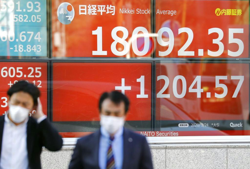 24日の東京株式市場の日経平均株価は、大幅続伸した。終値は前日比1204円57銭高の1万8092円35銭で節目の1万8000円を7営業日ぶりに回復した。終値の上昇幅としては約4年半ぶりの大きさで歴代9位だった。新型コロナウイルスの感染拡大による経済の一段の悪化を防ぐため、日本銀行や公的年金の運用主体が相場を継続的に買い支えるとの期待感が広がった。