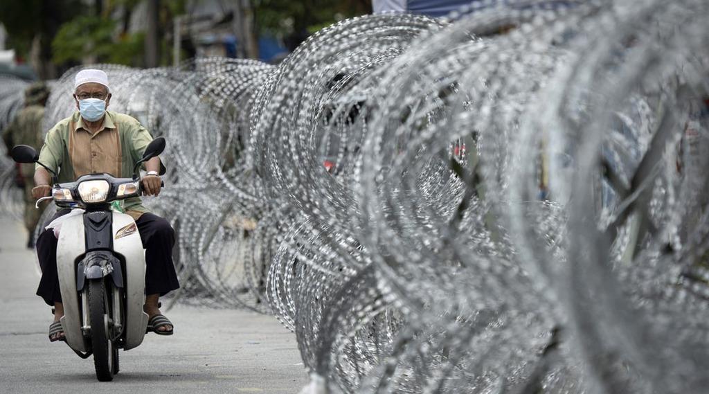 26日、マレーシアの首都クアラルンプール郊外の新型コロナウイルスの感染拡大を防ぐために封鎖された地域で、有刺鉄線のフェンスのそばをバイクで走る男性。米ジョンズ・ホプキンズ大の集計によると、マレーシアでは3月中旬から感染者数が増え始め、26日夕(日本時間)までの感染者は5742人、死者は98人に上っている。