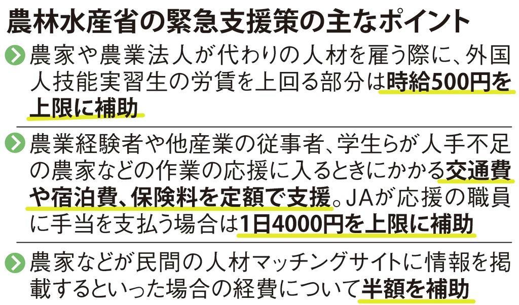 当てにしていた技能実習生の来日の見通しが立たない農家や農業法人が他業種などから新たに人を雇う際に、技能実習生の労賃を上回る部分については時給500円を上限に補助する。