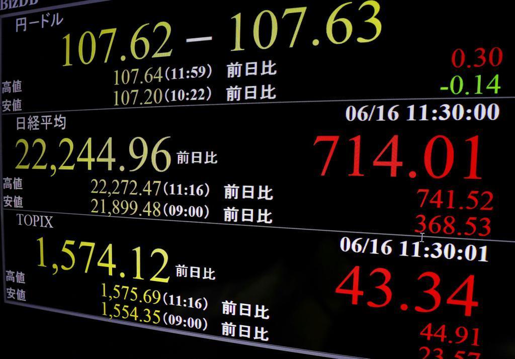 午前終値は前日終値比714円01銭高の2万2244円96銭。東証株価指数(TOPIX)は43・34ポイント高の1574・12。
